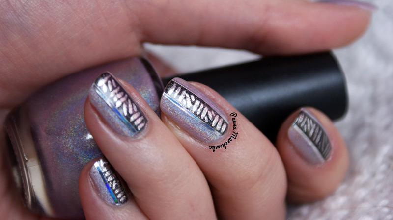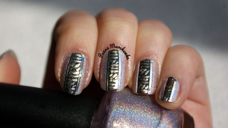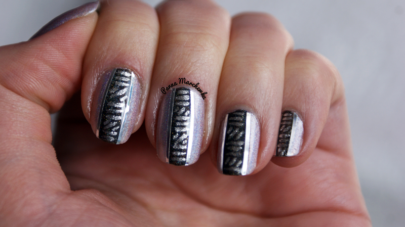 Do urozmaicenia tego nijakiego holosia użyłam jego potomka w postaci czarnego okazu, który sama kiedyś zmieszałam i pokazałam wam TU. Na brzegach czarnego paska przykleiłam srebrną tasiemkę, którą kupiłam w sklepie born pretty store.