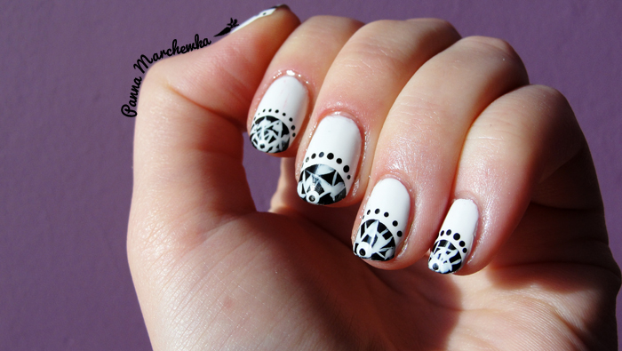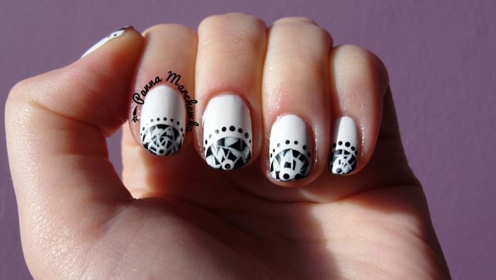 Zawsze podczas oglądania serialów muszę coś mazać na paznokciach (jak na maniaczkę serialową przystało oglądam trzy seriale- na bieżąco Walking Dead i Pamiętniki wampirów, dodatkowo na zapełnienie luk między premierami nowych odcinków oglądam Plotkarę 5 sezon ) no i wczoraj podczas kolejnego seansu z Plotkarą nie mogło być inaczej. Wygrzebałam pierwszy lepszy lakier i postanowiłam coś zmalować. Padło na biel i czerń no i na geometryczne kształty. Ogólnie nie miałam pomysłu ani wizji na zdobienie, ale chyba wyszło całkiem ciekawie.