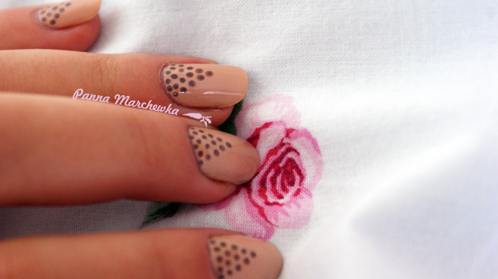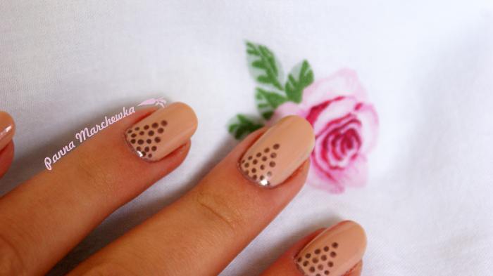W przerwach od pisania oczywiście zajmuję się moimi pazurkami. Od 3 dni (!!) mam na paznokciach bardzo skromne, a zarazem jak efektowne zdobienie z nieśmiertelnymi kropkami. Bardzo polubiłam się z tym mani no i niechętnie je zmyję (zwłaszcza że nie mam tyle czasu ile bym chciała by zmalować coś ciekawszego)