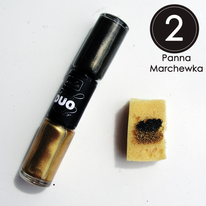 2. Jedną gąbeczkę malujemy lakierami- tworzymy dwie osobne kreski mniej więcej grubości paznokcia, a środek pokrywamy dwoma na raz by kolory ładnie się zmieszały