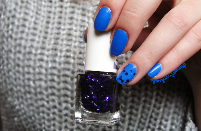 Mowa o jednym z lakierów od H&M, który kiedyś kupiłam na allegro. Dokładnie chodzi o kabaltwoym błękicie o nazwie Blue My Mind, który skromnie przyozdobiłam gitterem od wibo, który trafił w moje łapki przy okazji promocji w rossmannie (niestety zapomniałam się nim pochwalić przy okazji posta o zakupach z 40% rabatem). Co do brokatowego lakieru z serii Futura to jestem lekko rozczarowana, w sklepie wydawał mi się naprawdę fajny, a na paznokciach szału nie robi. Mój egzemplarz nosi nr 1 i składa się z mniejszych i większych sześcianów o kolorze fioletowo-niebieskim zatopionych w bezbarwnej bazie.