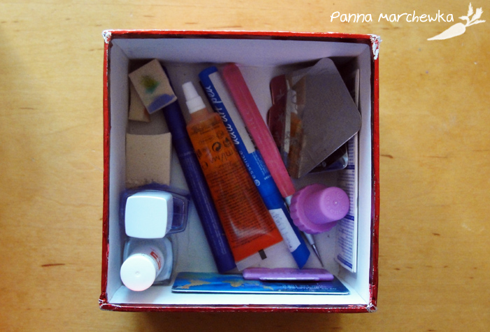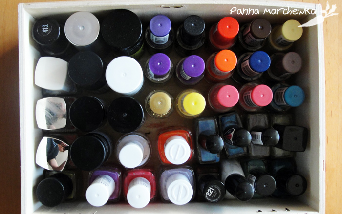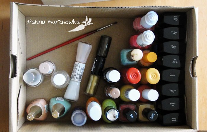 Odkąd moja kolekcja stała się większa niż 10 lakierów zaczęłam je trzymać w ozdobnym, drewnianym pudełku, w którym to wcześniej trzymałam jakieś śmieciowe rzeczy. Jednak od niedawna moje lakiery już się tam nie mieszczą i musiałam zagospodarować na nie nowe opakowanie- padło na pudełko po butach, które niedługo zamierzam ładnie ozdobić- chwilowo nie mam ani materiałów ani czasu na to. Do tego dołączyłam jeszcze mniejsze pudełeczko na moje duperele jak oliwki do skórek, odżywki czy bazy.