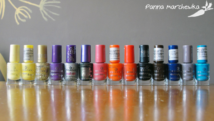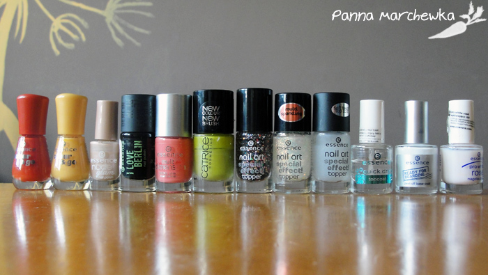 A teraz moja lakierowa kolekcja. Jak widać jest zdominowana przez lakiery essence- lubię je ze względu na kolory i cenę- jakość mogę przeboleć.
