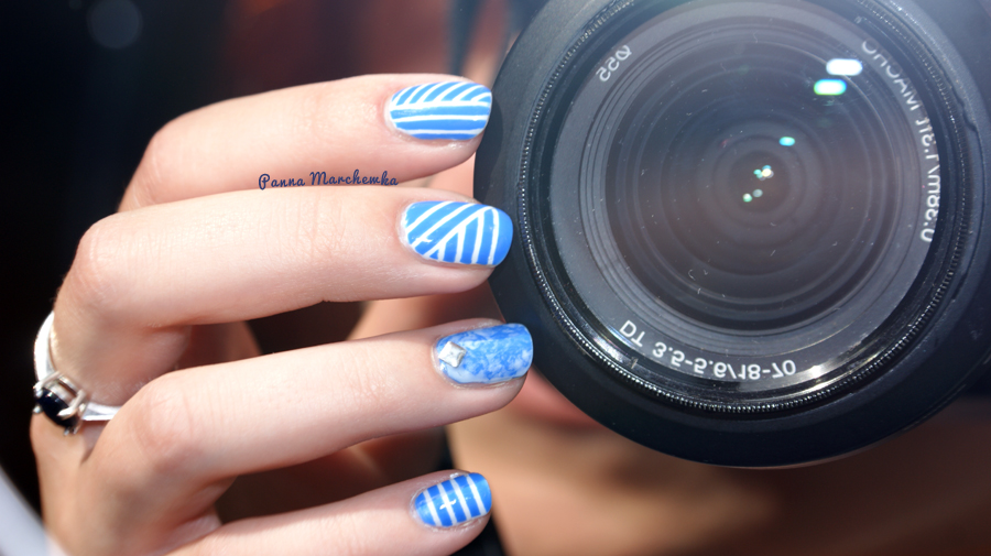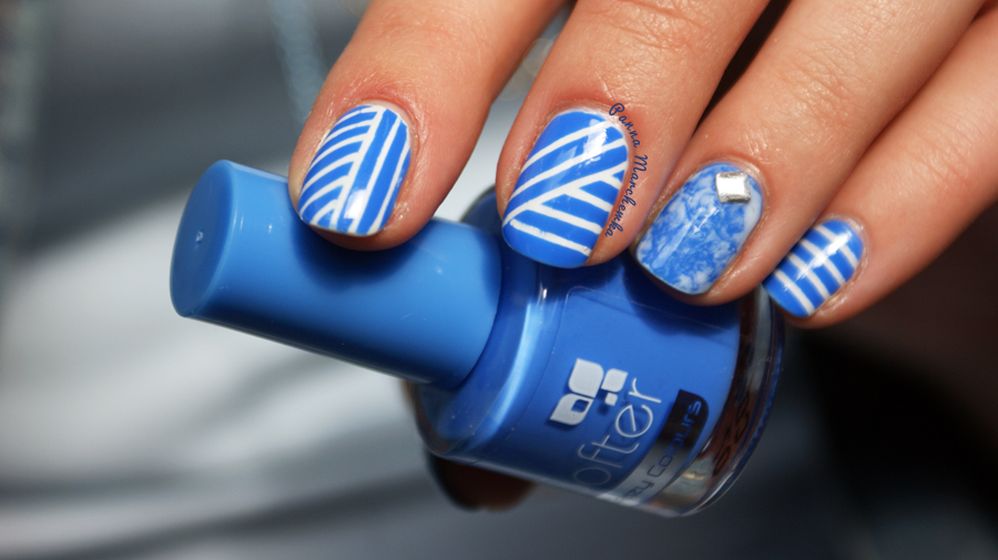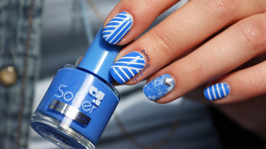 Jako bazy użyłam perłowej bieli od Enjoy, która po porządnym wyschnięciu została pokryta cienką tasiemką, a następnie pomalowana chabrowym lakierem Softer 27, który to niby pachnie przy wysychaniu. Ja zapachu chyba nie czułam- a przynajmniej nie pamiętam. Całość malowało się sprawnie. Niestety na palcu serdecznym wzór mi się rozmazał więc postanowiłam pomalować go metodą saran wrap- najpierw nałożyłam niebieski, na który poszła biel. Do tego nakleiłam ćwieki. Z całosci byłam bardzo zadowolona i z przyjemnością pokazywałam światu moje pazurki 🙂