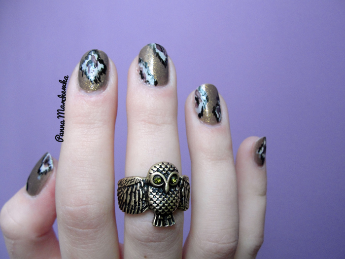 Kiedyś, kiedyś kupiłam sobie lakier wibo, o którym było głośno na blogach, mi niestety lakier nie przypadł do gustu i leżał zapomniany pomiędzy lakierami… wczoraj stwierdziłam jednak że będzie pasował do mojego stroju i o dziwo lekko zmieniłam o nim zdanie. Po dniu noszenia go solo domalowałam parę plam i powstało całkiem fajne zdobienie, które już kiedyś gościło na moich paznokciach.
