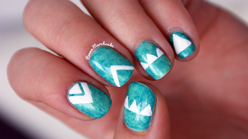 Do tego mani użyłam moje nowe cacuszko, które przywędrowało do mnie od Bambi, czyli cudowny miętowy Barry M- jest on bazą całości- na niego nałożyłam cieniutką warstewkę MIYO w odcieniu Malachitowym (tak się zwie na opakowaniu) i wszystko pociapałam kawałkiem foliowej reklamówki. Czyli tak zwana metoda saran wrap- do tego białe trójkąty i gotowe.