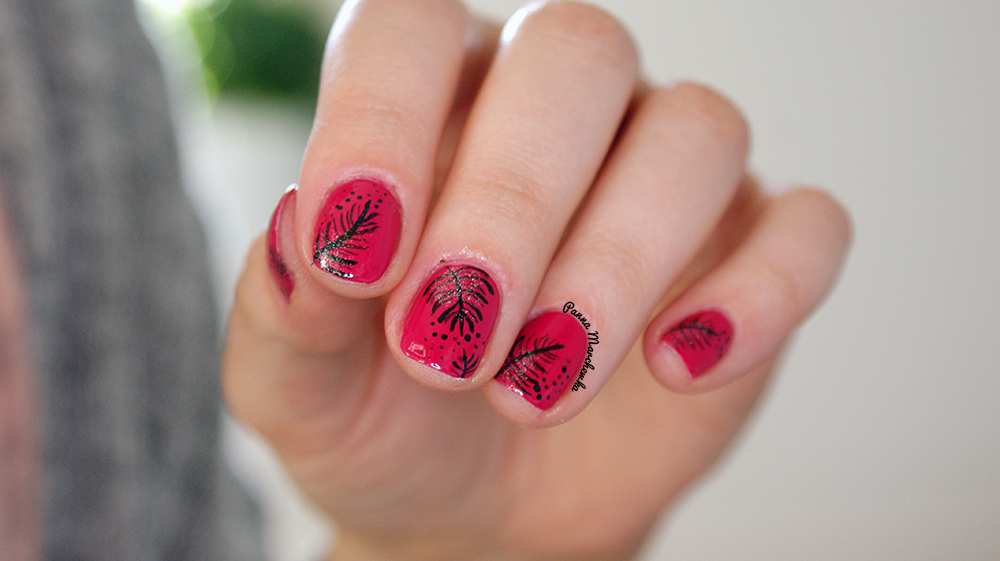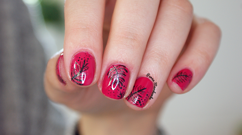 Co do zdobienia- noo to zbyt wymyślne to ono nie było. Za pomocą cienkiego pędzelka i farbki akrylowej zmalowałam coś na kształt tropikalnych liści (choć mój luby stwierdził ze to jakieś azjatyckie wzory… właściwie w Azji też jest ciepło) i w niektórych miejscach dodałam holograficzną poświatę nałożoną gąbeczką.