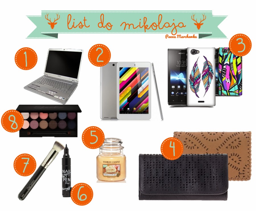 1.Nowy laptop- to moje największe życzenie. Dotychczasowy powoli umiera (coraz więcej klawiszy mi pada) 2. Tablet- to takie moje małe widzimisię 😀 O ile by mi to ułatwiło blogowanie ^^ 3. Nowe wdzianko dla telefonu KLIK KLIK 4. Nowy portfel! Rzecz niezbędna- mój stary przeszedł swoje i aż wstyd nieraz go wyciągać(czarny jest moim faworytem) ^^ KLIK KLIK 5. Świeca yankee candle- by w moim nowym domku pięknie pachniało KLIK 6. Pisak od Barry M- moje małe Must Have KLIK 7. Pędzel do podkładów- tak, przydał by się 🙂 KLIK 8. Paleta cieni Sleek KLIK