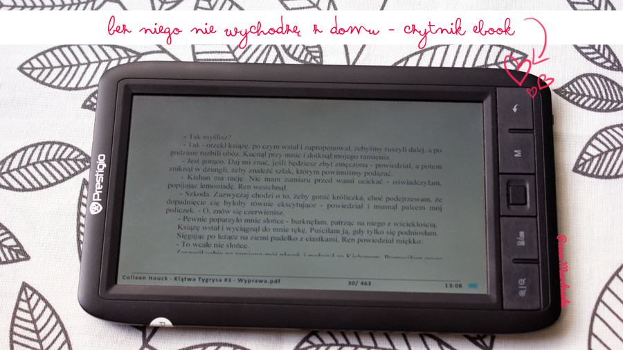 Od jakiegoś czasu czytuję sporo książek w wersji ebook. A wszystko zaczęło się od mojego lenistwa i otrzymania nowego telefonu. Lenistwo polegało na tym że po prostu nie chciało mi się iść do biblioteki czy też księgarni, a na telefonie znalazłam ciekawą aplikację ułatwiającą czytanie książek w formacie pdf. itd. Po przeczytaniu około sześciu lektur na małym monitorku mojego telefonu stwierdziłam że skoro i tak przekonałam się do takiej formy książki to może warto zaopatrzyć się w jakiś czytnik. I tak zaczęłam poszukiwać… i znalazłam. A wszystko dzięki mojemu Panu T