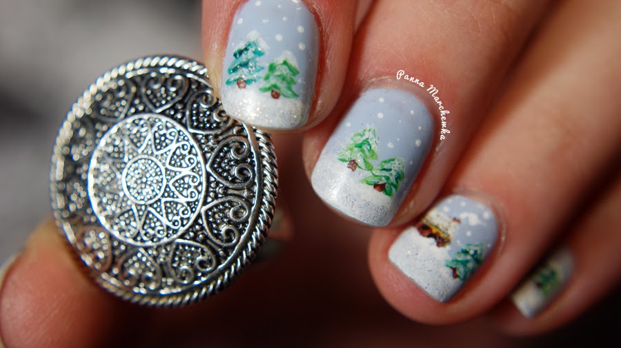 Święta nadchodzą… a śniegu za oknem nadal nie ma. Ja więc próbuję go przywołać malując go na paznokciach- najpierw były śnieżynki… a dzisiaj cały zimowy widoczek.