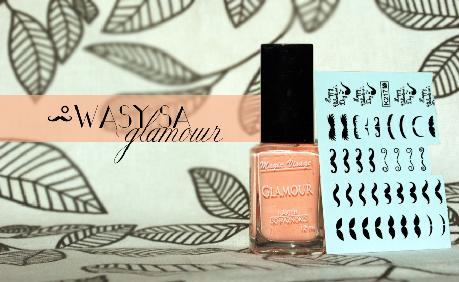 Najpierw jednak zacznę nie od wąsów, a od tła jakim jest prześliczny lakier Glamour, który dorwałam jakiś czas temu w Netto za całe 2,99. Jest to urocza pastelowa brzoskwinka o kremowym wykończeniu. Kryje nieźle, jednak smuży i by płytka była idealna trzeba jednak 3 warstw. Ostatnio przyzwyczaiłam się do 3 warstw i nie robi to na mnie tak dużego wrażenia jak kiedyś- dla mnie to prawie norma. Wracając do lakieru- schnie w mgnieniu oka! Ostatnio nawet koleżanka nie związana z tematem lakierowym stwierdziła że ten lakier jest świetny bo wysycha prawie że od razu. Dla mnie to spory plus, chociaż i tak wspomagam się Poshe (jestem uzależniona od tego Topu- bez niego nie potrafię malować paznokci!)