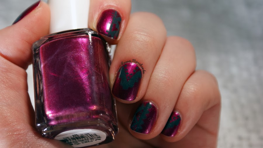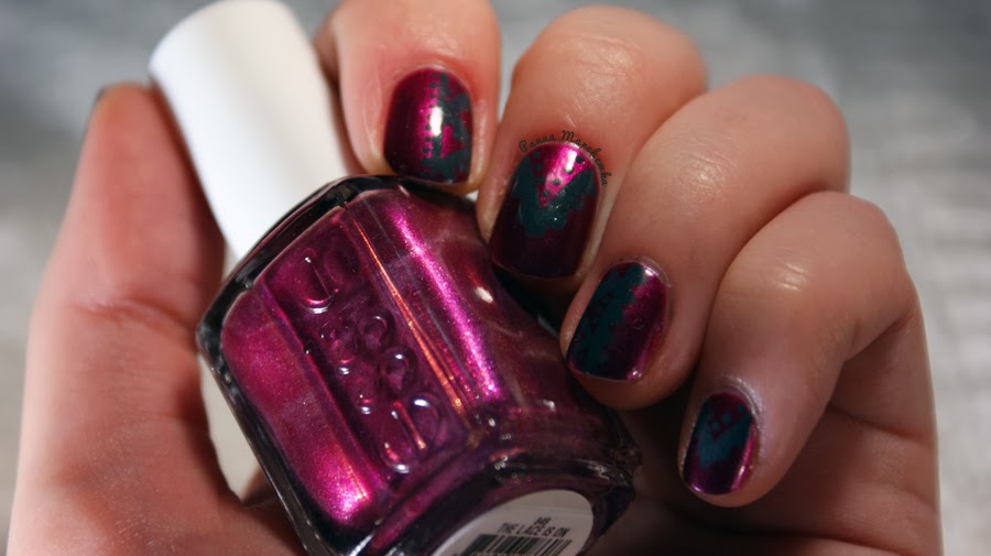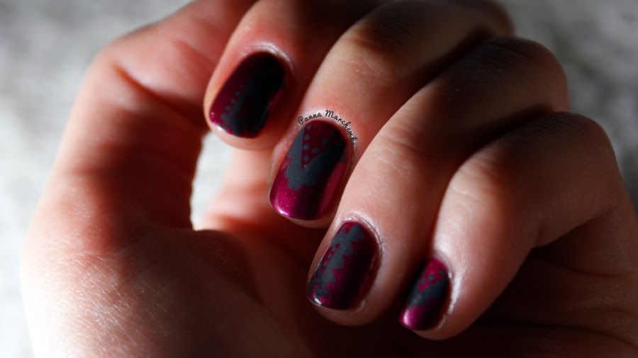 Nie ukrywam- jak zobaczyłam co znajduje się w jesiennym zestawie lakierów od essie to tą fuksję odłożyłam na bok i nawet nie chciałam na nią patrzeć. Jakoś mnie nie zachwyciła- zbyt się mieniła, kolor wydawał się zbyt krzykliwy… noo ale coś mnie tknęło po tym jak zobaczyłam TO mani u Tamit24. Postanowiłam wykonać coś podobnego- dobrałam szary cashmere bathrobe z tej samej kolekcji i na podstawie TEGO zmalowałam delikatne, azteckie mani. Niestety w świetle dziennym wzór nie był zbyt widoczny na paznokciach- The lace is on całkowicie przyćmił szarego kolegę.