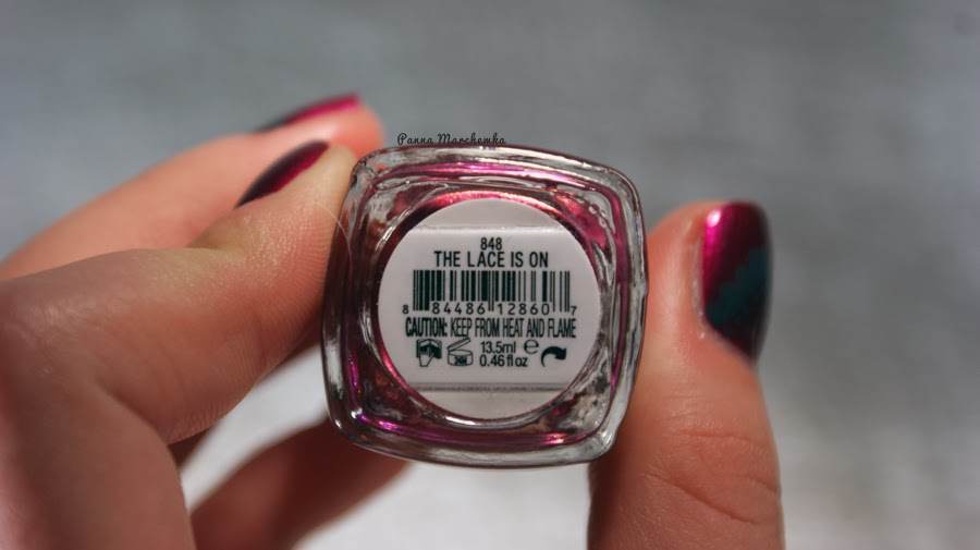 Powracając jednak do lakieru dnia- czyli The Lace Is On- jest to stonowana, opalizująca fuksja, która ma dość nietypowe wykończenie. W pierwszej chwili byłam pewna że to metalik… ale na płytce wygląda on całkowicie inaczej. Pięknie iskrzy się w słońcu srebrno- różowymi drobinkami. Z tego co wyczytałam u Tamit24 to według niej aplikacja była dosyć trudna- ja niestety z tym się nie zgodzę. Mi tym lakierem świetnie się malowało, nie zauważyłam smug, które by mi mocno przeszkadzały, nie rozlewał się po skórkach i wysychał w błyskawicznym tempie. Do pełnego krycia potrzebowałam dwóch grubszych warstw. Całość oczywiście utrwaliłam Topem. Lakier jest z serii profesjonalnej, która wyróżnia się cienkim pędzelkiem. U mnie ten lakier wytrzymał całkiem długo bo 4 dni bez odprysków- jedynie starły się końcówki.