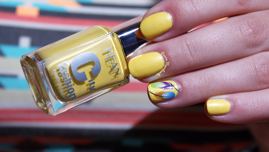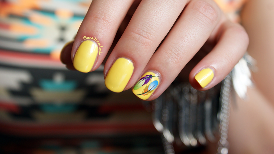 Do ozdobienia tego kurczaczka postanowiłam dodać naklejki wodne- piórka, które dostałam od sklepu Born Pretty store. Naklejki urzekły mnie swoją lekkością i kolorystyką. Dostajemy je wraz z 10 innymi wzorami na wielkim kartonie- każde piórka są w innych kolorach i formach więc jest w czym przebierać KLIK. Ja miałam plan zrobić z tych piórek mały łapacz snów- niestety z racji tego ze każde piórko jest skierowane w tą samą stronę wyglądało by to kiepsko. Mimo wszystko piórka na paznokciach bardzo ładnie się prezentują i przykuwały uwagę ludzi w mojej księgarni 🙂