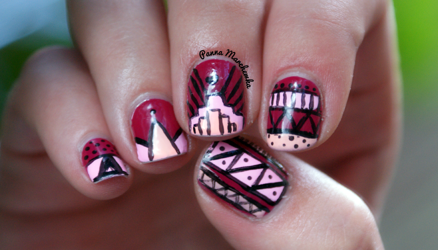 Lakier ma świetną konsystencję- jak to MS i nieźle kryje- do tego ładnie pachnie! Nie jest to duszący zapach, a delikatny cukiereczek. Nie powala na kolana, ale też nie przeszkadza. Jest to miły akcent przy malowaniu. Co mnie najbardziej zaskoczyło to trwałość! Lakier wytrzymał u mnie chyba z 5 dni- a muszę podkreślić że to były bardzo intensywne dni gdy to nosiłam gruz (wywalaliśmy ściany w mieszkanku) sporo sprzątałam (po wywalaniu ścian sporo się brudzi), a lakier wyglądał na nienaruszony. Czwartego dnia lekko mi odprysł- ale załatałam plamę i stwierdziłam ze pora na jakiś akcent na paznokciach. Dodałam troszkę etnicznych kształtów inspirowanych blogiem pshiiit.
