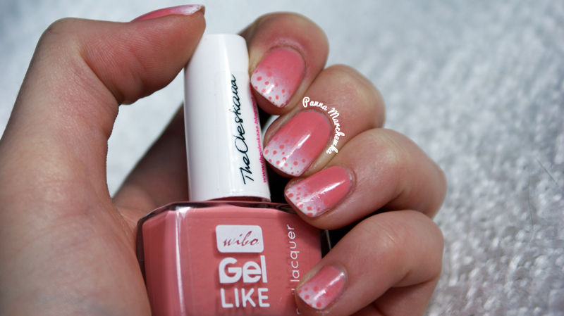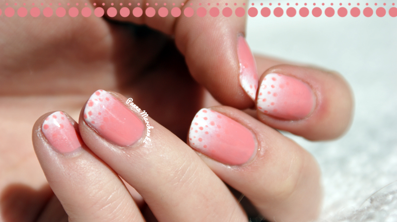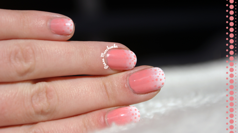 Postanowiłam też troszkę się pobawić i dołożyłam lekki gradient a na to kropki. Całość przypomina mi truskawki w śmietanie. Wyszło delikatnie i ładnie.