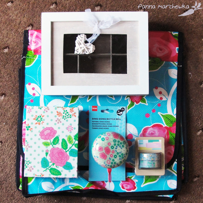 na zdjęciu widać dzwonek i torbę do roweru, taśmy samoprzylepne ozdobne, pudełko na herbaty i notes, zabrakło jednak lakierów (kupiłam jeszcze essi i essence nude glam za 0.50 euro) |