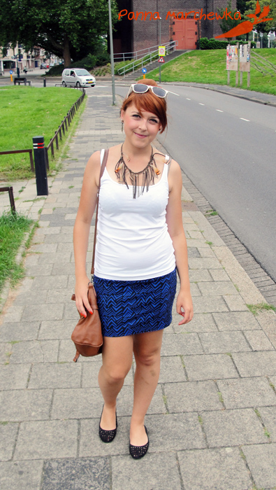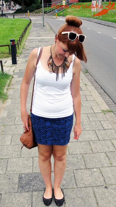Torba i spódniczka New Yorker, top no name, baletki i wypełniacz do koczków- H&M, naszyjnik- House, okulary– C&A