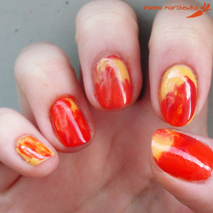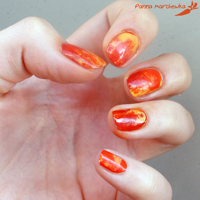 Mani banalnie proste, tylko mocno brudzące skórki- porobiłam na płytce plamki każdym odcieniem lakierów, które wczoraj zakupiła i przykryłam kawałkiem foli bądź reklamówki- po odklejeniu (od razu) wychodzi nam rozmazana ciapka.