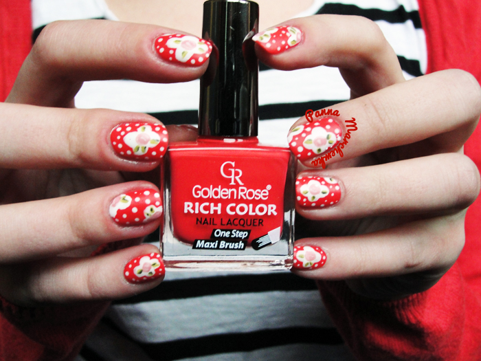 By nie było zbyt nudno na paznokciach postawiłam bazowy kolor przyozdobić- nie wiem czemu jedyne co mi do tego koloru pasowało to kwiatki… noo i zmalowałam, różyczki, na białych tłach. Wyszło znowu słodko, ale mi się podoba. Wzór podejrzałam TU.
