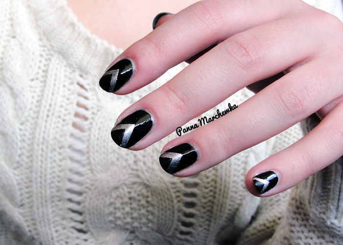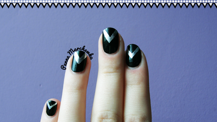 Ostatnio coś mnie tchnęło na czarne paznokcie- najpierw zmontowałam moje pierwsze ruffian manicure, które wyszło tak krzywe że nawet nie zrobiłam zdjęć upamiętniających, a potem stworzyłam to co wam zaraz pokarzę- czerń i srebro to ładna para, czyż nie? Troszkę taśmy, troszkę czasu i Voilà.