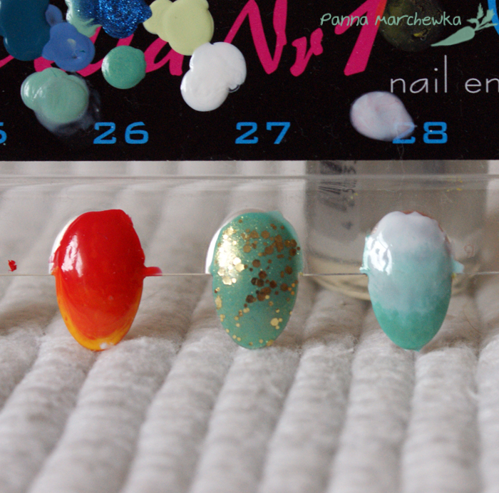 Jako że szkoda mi było mojego mani zdjęcia pokazujące matowienie zrobiłam na próbnikach, na których testuję pomysły na wzorki 🙂