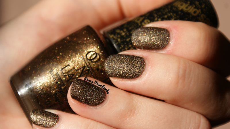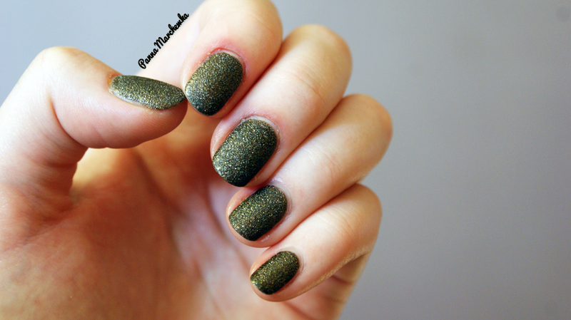 Po pomalowaniu próbników bardziej spodobał mi się jednak ten drugi, do którego nie byłam tak przekonana w chwili zakupu. Na żywo jednak całkowicie mnie zachwycił swoją prostotą i fakturą. Lakier jest naprawdę niesamowity- w cieniu matowy, ziemisty odcień w słońcu zamienia się w błyszczącą, nieoszlifowaną bryłkę złota- i do tego pięknie się mieni. Miłość od pierwszego wejrzenia- dosłownie! A szczerze- w pewnym momencie nawet żałowałam że się na niego zdecydowałam bo zdjęcia w internecie jakoś nie zachwycają- widać trzeba to zobaczyć na żywo.