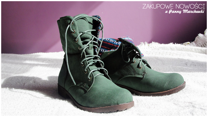Mają genialny odcień zieleni i świetną wyściółkę z printem azteckim, która po wywinięciu całkowicie zmienia but (najbardziej to widać na pierwszym zdjęciu na samej górze notki). Kupiłam je na tutejszym targu, który jest otwierany co weekend i na którym można dostać wszystko- od starodawnych śmieci (sprzedawali nawet stare zużyte pisaki) po właśnie odzież i obuwie- morze nie najwyższej jakości ale perełki zawsze się znajdą. Ja za swoje buty dałam 72zł- nie jest to skóra, ale wyglądają porządnie, mają lekkie ocieplenie i na jesień będą jak znalazł.